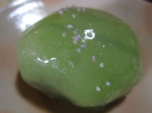 薄緑色の餡の上に、小さな小さな桃花色の花びらを散らして。